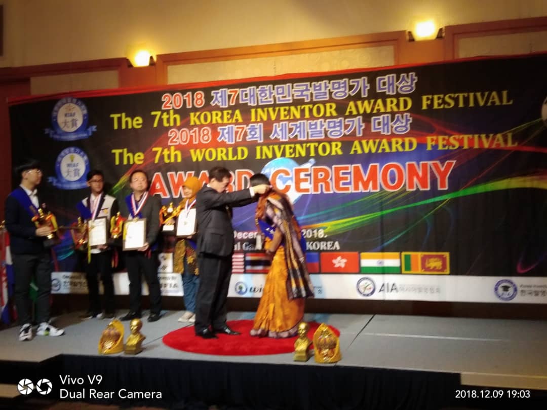 Dr Sharmini Gopinathan from Faculty of Management has made the university proud by winning an international award on Educational Development Order of Merit at the 7th Annual Korea Inventor Award Festival 2018 on 9 December 2018. She was also the only Malaysian that received the award in this category.