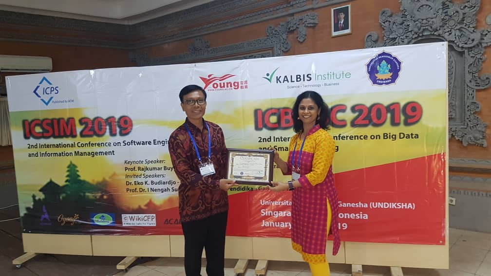 Dr. Rathimala Kannan, a lecturer from the Faculty of Management (FOM) won Best Presentation Award at The 2nd International Conference on Software Engineering and Information Management (ICSIM 2019) and its workshop: The 2nd International Conference on Big Data and Smart Computing (ICBDSC 2019) in Bali, Indonesia. The conference was co-organised by Universitas Pendidikan Ganesha (Undiksha), Indonesia and Kalbis Institute, Indonesia from 10 until 13 January 2019.