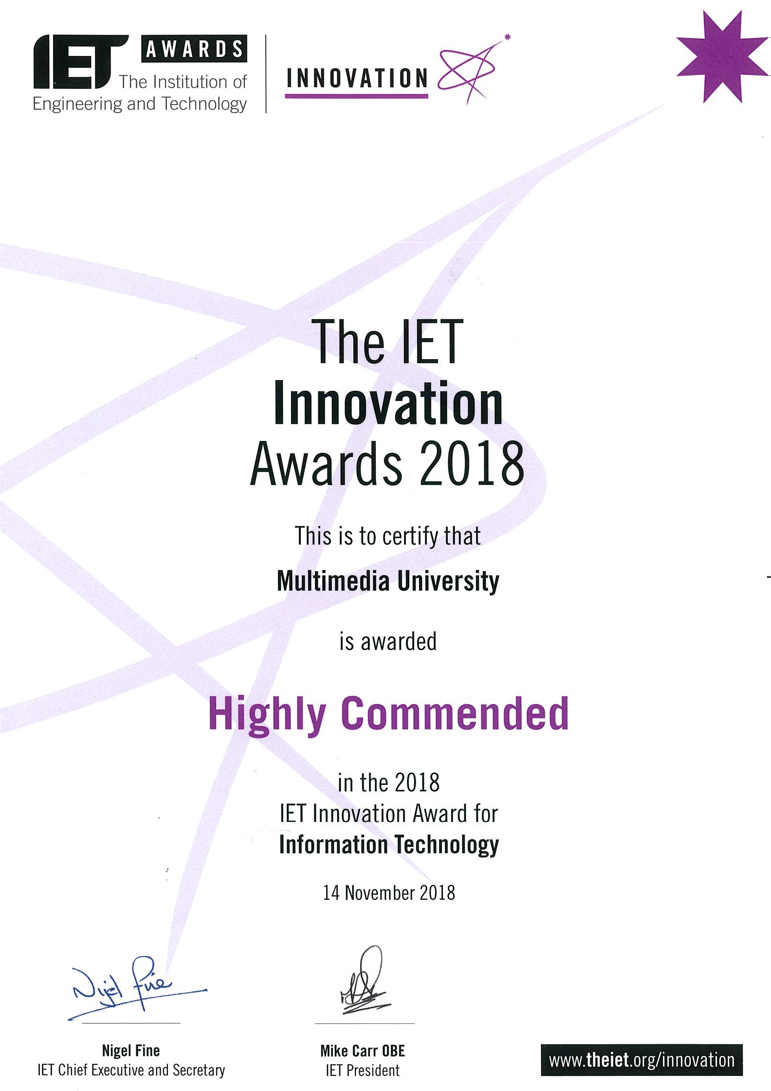 FET Professor, Ir. Prof. Dr. Sim Kok Swee and his team were awarded the “Highly Commended” Award in the 2018 IET Innovation Award for Information Technology, hosted by Institution of Engineering and Technology (IET) United Kingdom (UK) in London. This award carries good name to Multimedia University (MMU) and TM as the selection process for the award was quite tedious and also involved projects from top universities around the world.