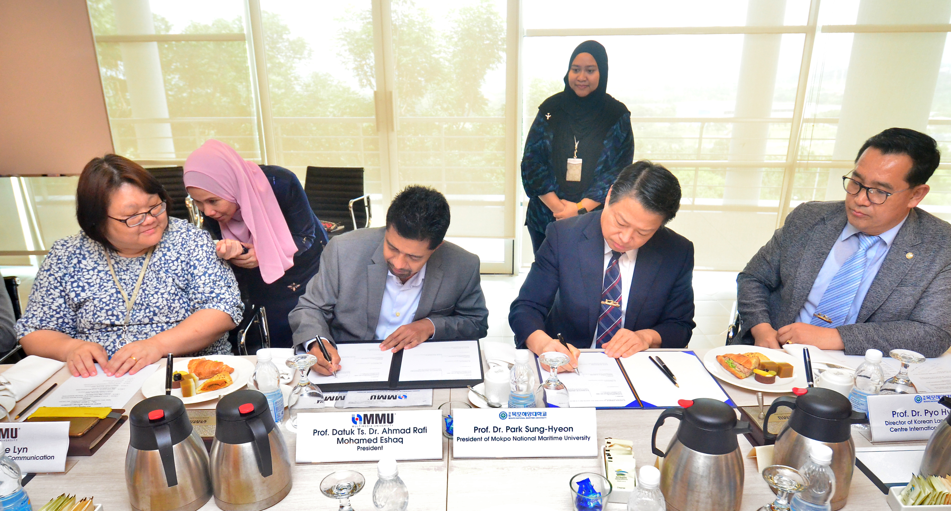 A memorandum of understanding (MoU) was signed between Multimedia University (MMU) President, Prof. Datuk Ts. Dr. Ahmad Rafi Mohamed Eshaq and the Mokpo National Maritime University (MNMU) of Republic of Korea president, Prof. Dr. Park Sung-Hyeon in MMU Cyberjaya recently. The auspicious ceremony was witnessed by Dr. Ong Sue Lyn, Dean of Faculty of Applied Communication (FAC) and Prof. Dr. Pyo Hyun-Young Director of Korean Language and Cultural Centre, International Exchange Division of MNMU.