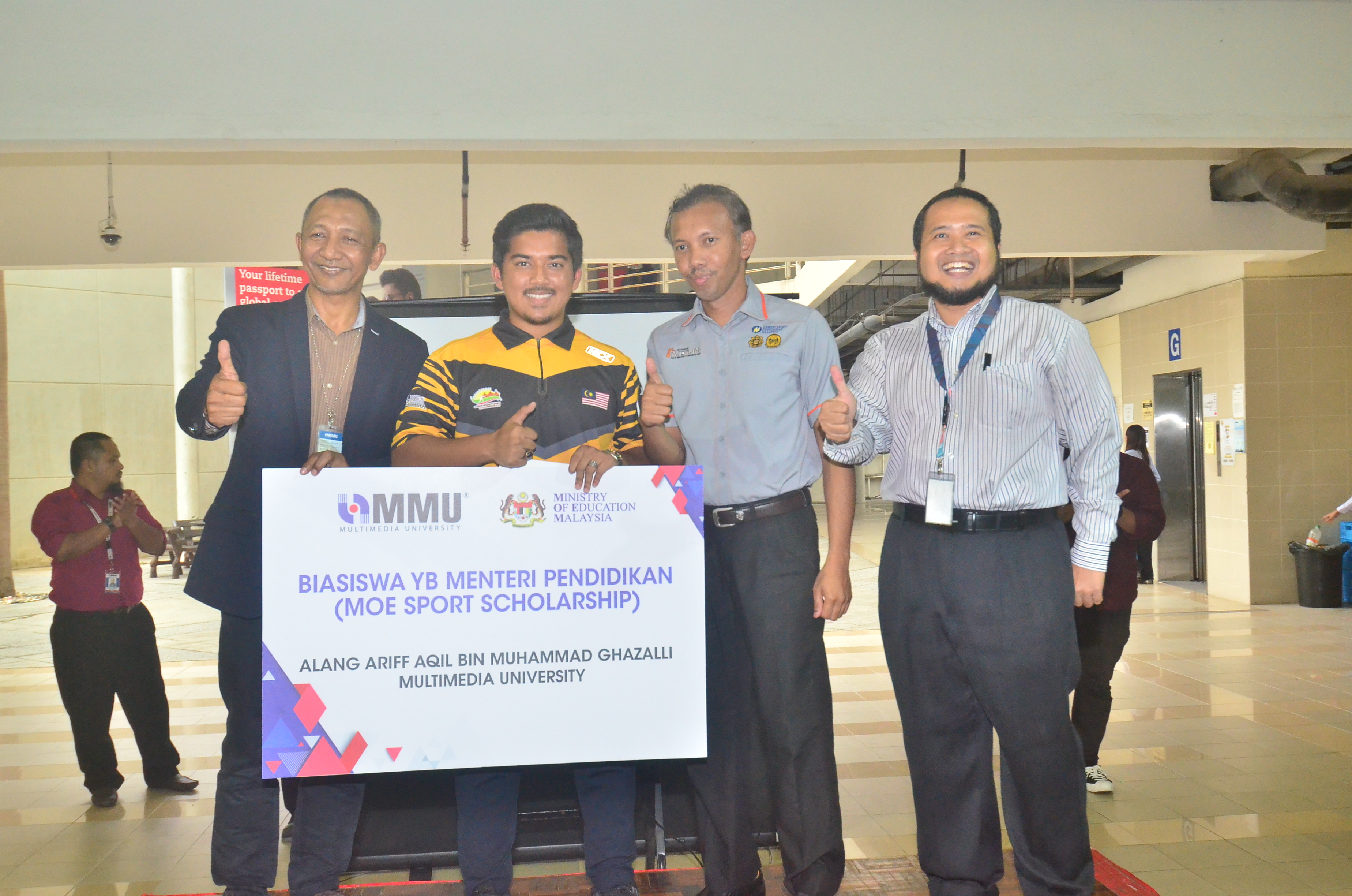 Alang Arif Aqil Muhammad Ghazali, a student from Faculty of Creative Multimedia (FCM) received the Ministry of Education (MOE) Sports Scholarship during an appreciation hi-tea ceremony at MMU Cyberjaya recently. The scholarship was presented by Mr Tony Azman Hassan, Chief Assistant Secretary for Sports at the Higher Education Sector, Ministry of Education (MoE). Also present at the ceremony were Dr. Abdullah Sallehhuddin Abdullah Salim, the Director of STAD and Mr. Mohd Amin Abdullah Sani, the Senior Director of Human Capital Management (HCM) MMU.
