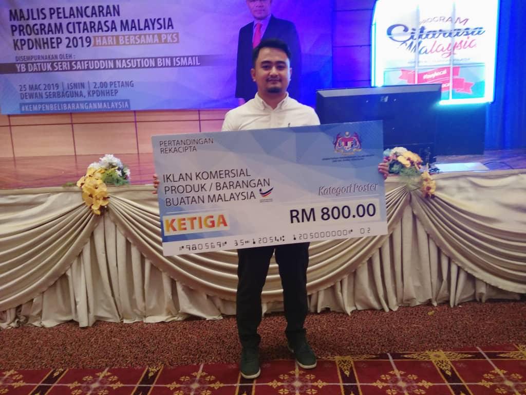 Other than that, Abdul Muqsit Hassan from Faculty of Creative Multimedia (FCM) won third place for poster category at the Pertandingan Merekacipta Iklan Komersial Produk/ Barangan Buatan Malaysia 2018 in Putrajaya recently. Organised by the Ministry of Domestic Trade and Consumer Affairs (KPDNHEP), the competition was open to all students from Institute of Higher Learning, whereby they were required to produce a commercial advertisement in promoting products which were produced by Small Medium Enterprise (SME) companies.