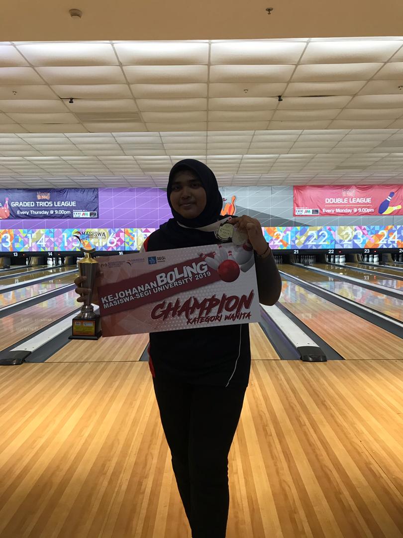 On 3 May 2019, Ms Nur Nasrin Ali, a student from Faculty of Information Science and Technology (FIST) won the Women’s Singles category in a Bowling Tournament, which was participated by students from universities and colleges in Malaysia. The tournament was hosted by SEGI with the collaboration of Majlis Sukan IPT Malaysia (MASISWA) at Wangsa Bowl IOI City Mall in Putrajaya. Ms Nasrin received RM450 and a trophy from the MASISWA officials.