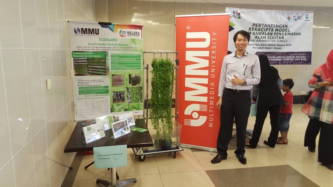 In this competition, participants are required to present a model designed using recyclable materials in promoting awareness of environmental preservation. FET team had presented, Eco-Friendly Vertical Garden (ECOGARD), a prototype of a vertical garden using recyclable plastic bottles. The ECOGARD is equipped with rain harvesting system which can collect rainwater and utilise it to water the plant, which makes the ECOGARD self-sustainable with minimal human intervention.