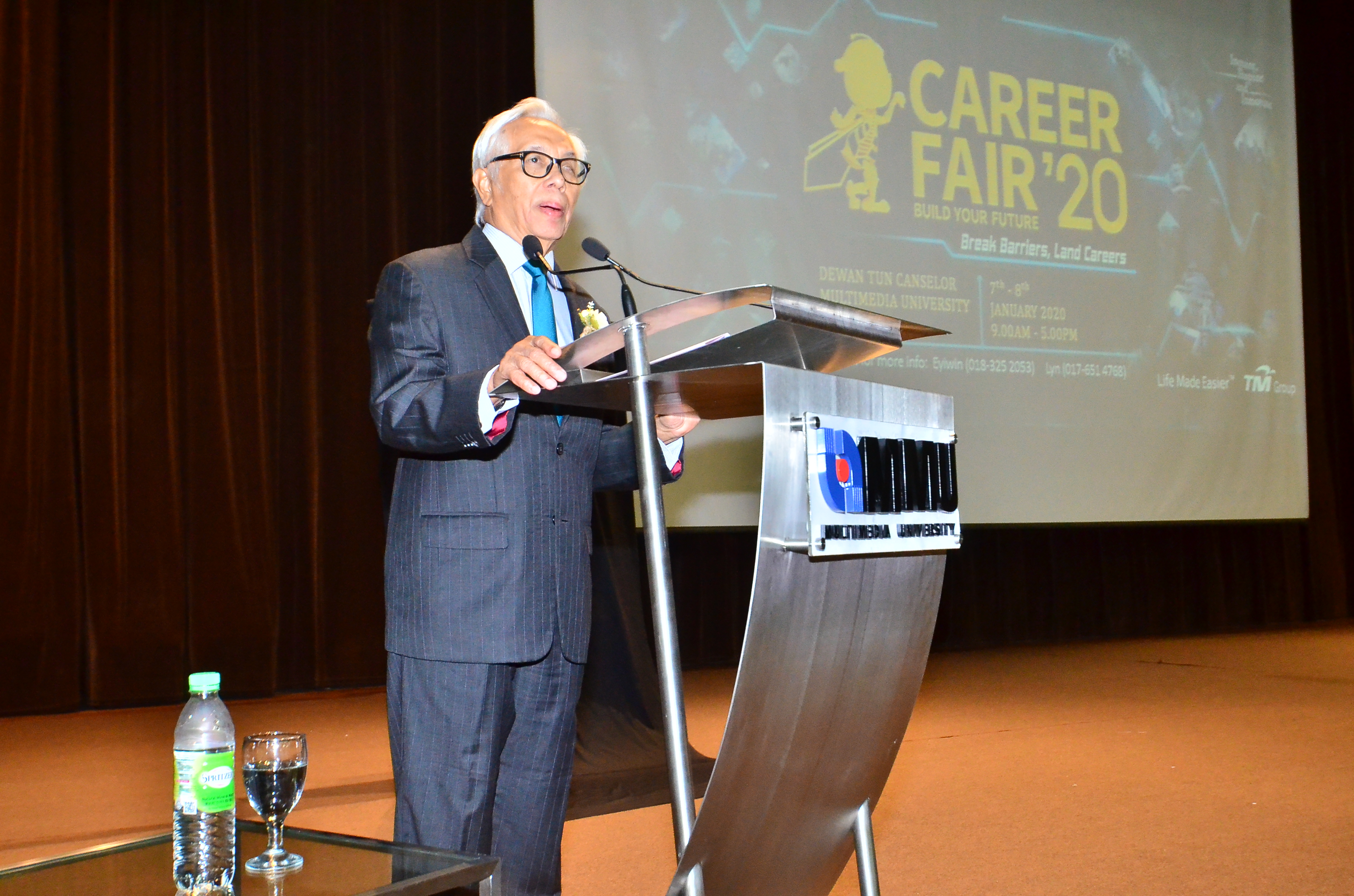 The opening ceremony was graced by Academician Professor Tan Sri Dr. Zakri Abdul Hamid, Pro-Chancellor of MMU. The ceremony was also attended by Prof. Datuk Ts. Dr. Ahmad Rafi Mohamed Eshaq, President of MMU, Mr. Sharbani Harun, Chief Financial Officer of Technology Park Malaysia, Dr Abdullah Sallehhuddin Abdullah Salim, Director of Student Affairs Division (STAD) and Eyiwin Wong, Director of MMU Career Fair 2020. Mr. Sharbani also conducted a sharing session with the audience during the opening ceremony.