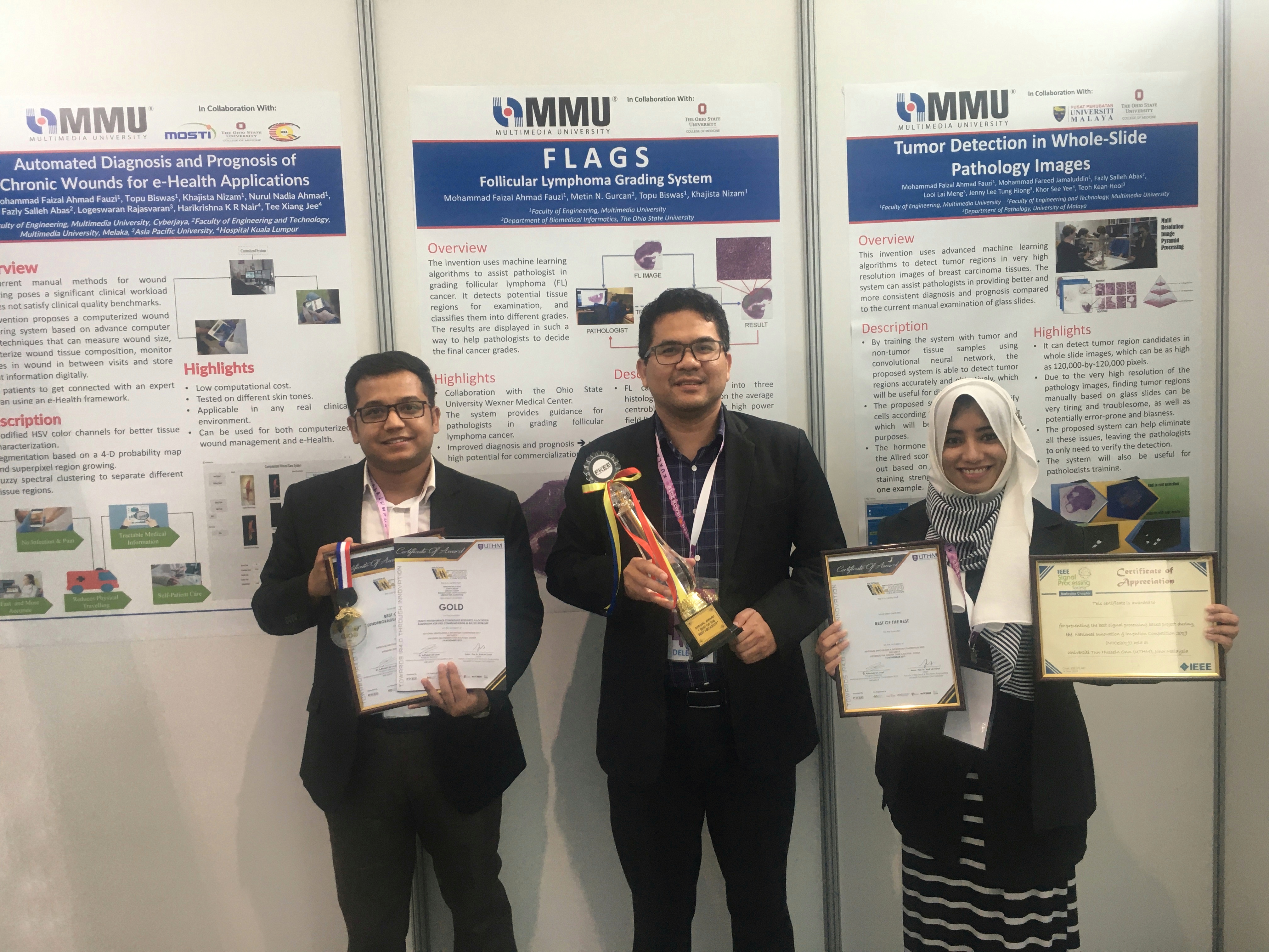We are proud to share that a project from Multimedia University entitled “Automated Diagnosis and Prognosis of Chronic Wounds for e-Health Applications”, led by Associate Professor Dr. Mohammad Faizal Ahmad Fauzi from the Faculty of Engineering (FOE) with his MEngSc students Topu Biswas and Khajista Nizam, won the “Best of the Best Award” at the National Innovation and Invention Competition 2019 (NIICe2019) recently. The competition was held at Universiti Tun Hussein Onn Malaysia (UTHM) and received more than 240 projects demonstrated by researchers and students from various institutions