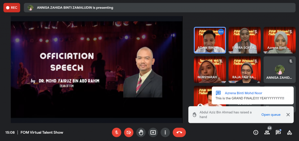 This event was organised for the first time with the objective of becoming a platform to discover FOM students’ talents and as a medium of stress-relief and source of entertainment among the community. The organiser extended their utmost gratitude to the FOM Outreach team members for their commitment in helping to make the event successful as well as to the faculty Dean, Dr. Mohd Fairuz Abdul Rahim for officiating and supporting the event.