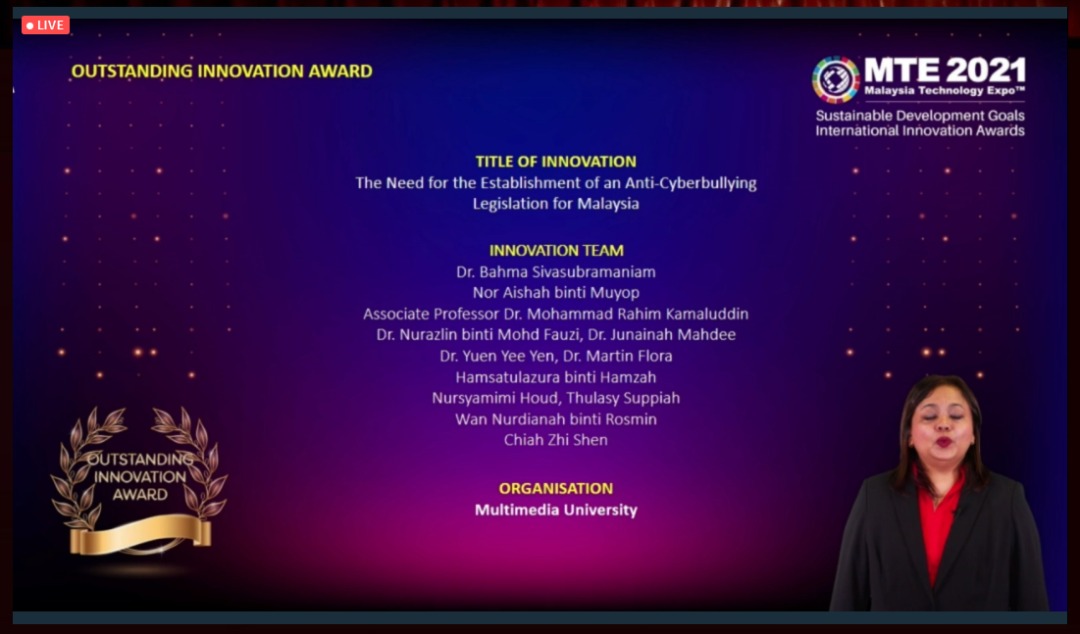 Multimedia University (MMU) won a gold medal at the Malaysia Technology Expo (MTE) 2021 SDG International Innovation Awards on 10 November 2021. A group of researchers from the Faculty of Management (FOM) namely Dr. Bahma Sivasubramaniam, Nor Aishah Muyop, Assoc. Prof. Dr. Mohammad Rahim Kamaluddin, Dr. Nurazlin Mohd Fauzi, Dr. Junainah Mahdee, Dr. Yuen Yee Yen, Dr. Martin Flora, Hamsatulazura Hamzah, Nursyamimi Houd, Thulasy Suppiah, Wan Nurdianah Rosmin, and Chiah Zhi Shen won the award with their project entitled ‘The Need for the Establishment of an Anti-Cyberbullying Legislation for Malaysia’.