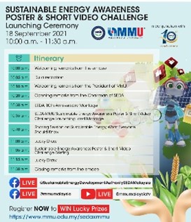 In September 2021, SEDA and MMU (Faculty of Creative Multimedia) came together to jointly organise the Sustainable Energy Awareness Poster & Short Video Challenge. This competition aimed to increase the awareness of renewable energy and sustainable energy amongst the youngsters and public. The use of creativity in delivering the intended messages through poster and video will attract the involvement of many.