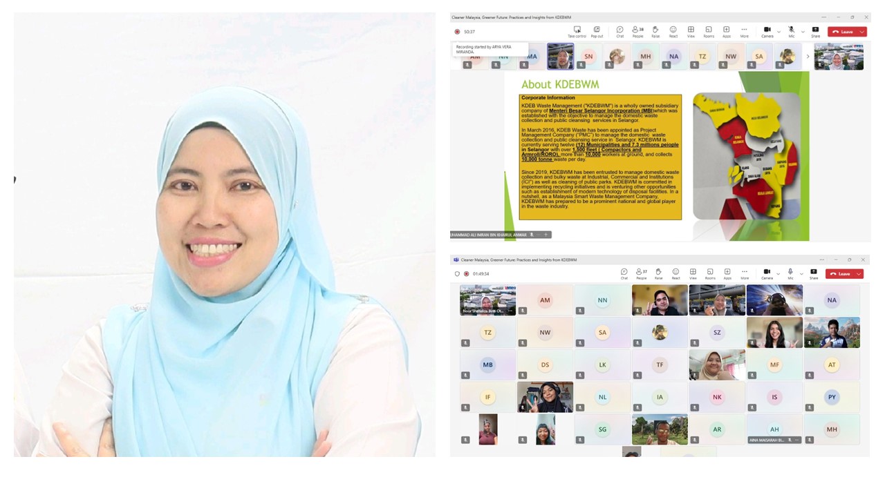 During her presentation, Puan Hajah Mahfuzah highlighted Malaysia’s challenges in solid waste management, including the daily generation of 38,000 tonnes of waste, limited landfill space, and the need for more sustainable solutions. She explained KDEBWM’s role in managing domestic waste across 12 municipalities in Selangor and introduced initiatives such as waste-to-energy plants, IoT fleet monitoring, recycling centres, and upcycling projects. Emphasising the circular economy approach, she encouraged collaboration among stakeholders to tackle low recycling rates and illegal dumping, reminding students that building a cleaner and greener Malaysia is a shared responsibility.