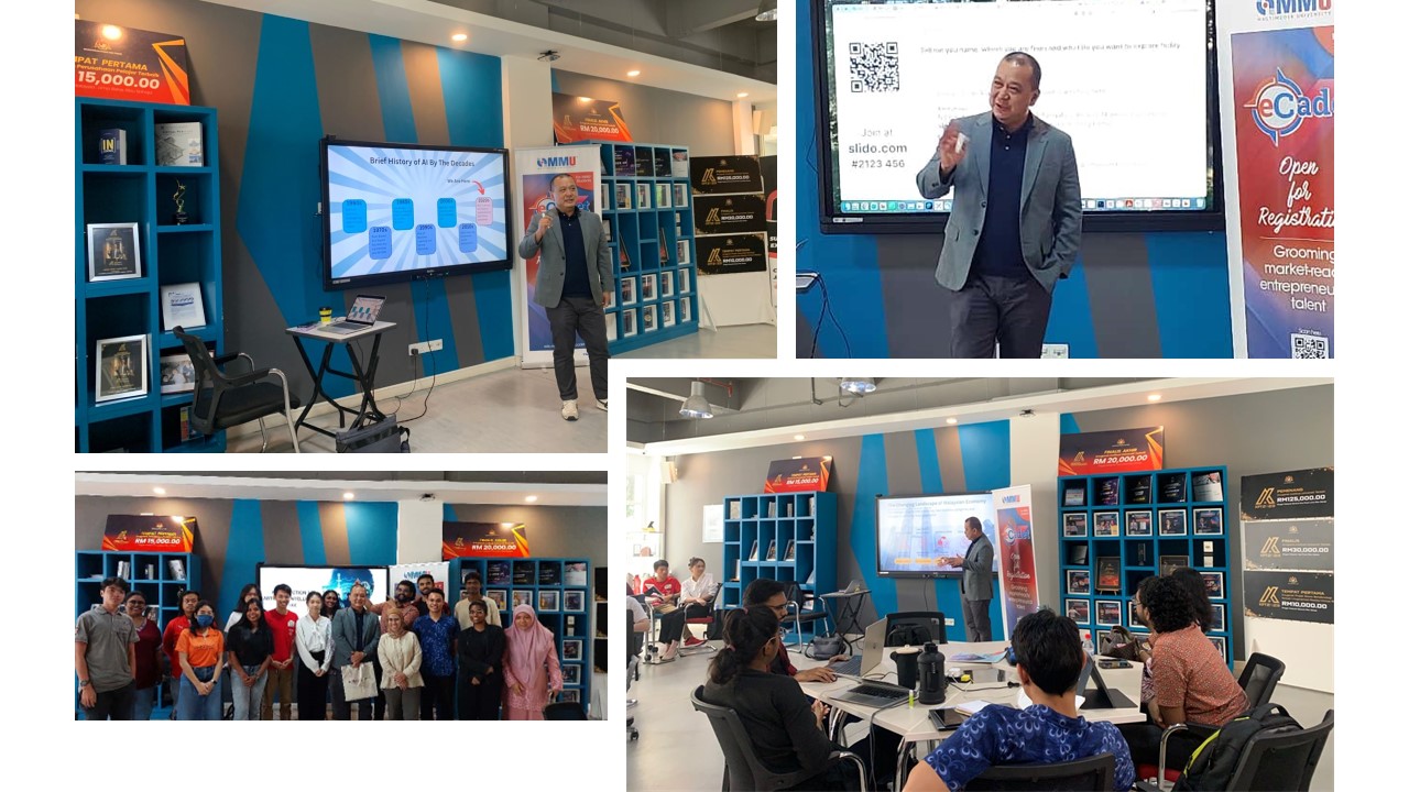 On 29 September 2025, MMU students gathered at the EDC Innolab for a session with Ts. Tajul Asni Ahamad, Chief Executive Officer of Intelligent Machines Sdn. Bhd. In his talk titled “AI Insights for Student Entrepreneurs”, he shared how Artificial Intelligence (AI) is reshaping the business landscape and provided practical strategies for students to innovate, grow, and future-proof their ventures. The session was highly engaging, with students asking questions, experimenting with AI tools, and gaining deeper understanding of its applications.