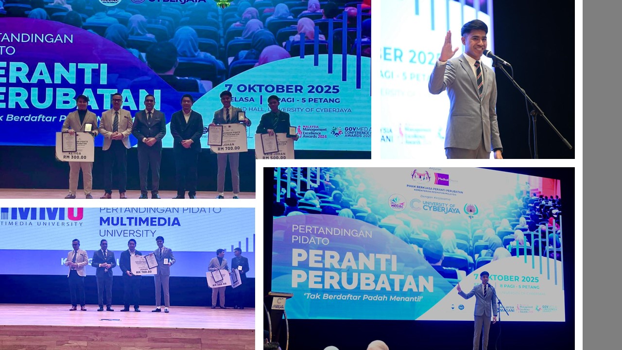 Muhammad Faris Fiqran Mohamad from the Faculty of Creative Multimedia (FCM) achieved another milestone when he was crowned champion in the University Category (Bahasa Melayu) at the Pertandingan Pidato Peranti Perubatan 2025, held on 7 October 2025 in Cyberjaya. The competition was held in conjunction with the ‘Program Kesedaran Awam Peranti Perubatan’, jointly organised by the Medical Device Authority (MDA) under the Ministry of Health Malaysia (MOH) with the support of University of Cyberjaya.