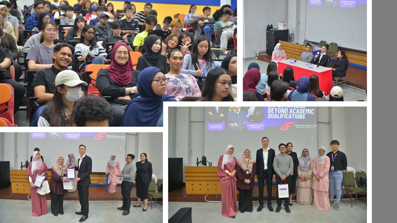 The session was delivered by three representatives from Azmi Fadzly Maha & Sim Law Firm (AFMSLAW): Mr. Norazmi Norazman, Mr. Ahmad Fadzly Abdul Gani, and Ms. Jasneeta Bhullar. The speakers shared insightful, real-world perspectives on what employers look for beyond grades, particularly what it takes to succeed as a fresh graduate entering the workforce. Students actively engaged with the speakers throughout the session, asking questions and seeking advice.