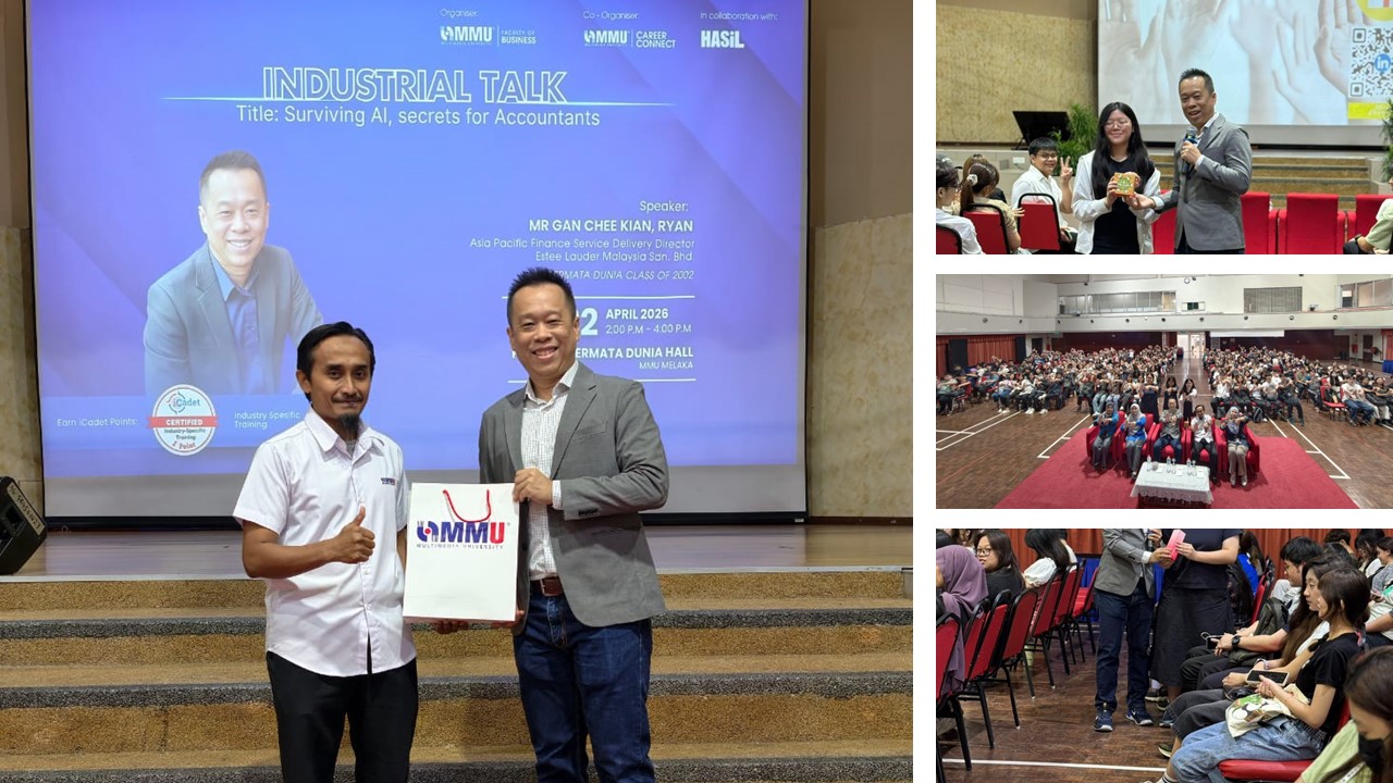 The Faculty of Business (FOB), in collaboration with MMU Career Connect Melaka, organised an industrial talk titled “Surviving AI: Secrets for Accountants” on 22 April 2026 at Persada Permata Dunia Hall, MMU Melaka Campus.