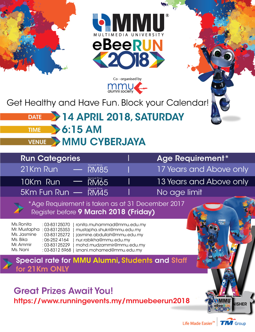 Calling all Runners! Join us at the MMU eBee Run 2018! Centre For Alumni is organising a running event on 14th April 2018 in Cyberjaya. From 5KM to 21KM, run together with your family members and friends. Great prizes await you! Sign up now at MMU eBee Run 2018 See you there!