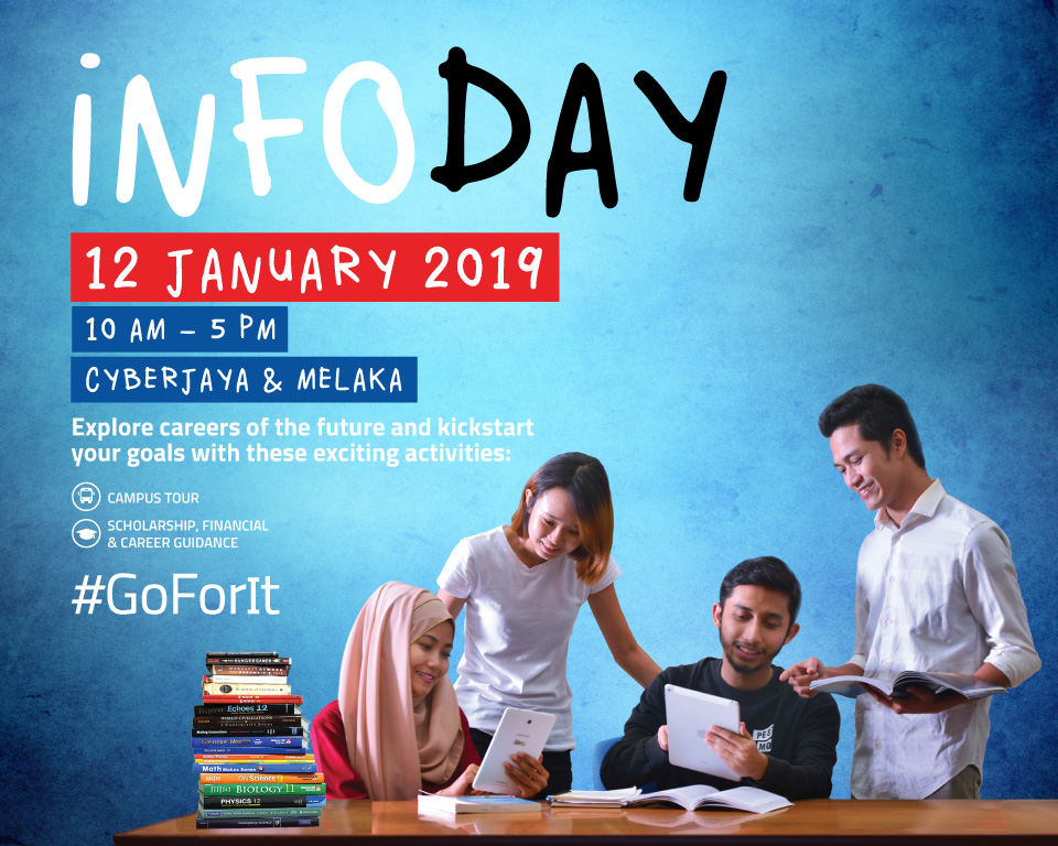 Wondering what’s the next step after SPM/IGCSE/UEP/STPM? Discover your next move at Multimedia University. Visit us at our Info Day and find out more on our wide array of courses. What’s more, we offer a huge range of scholarships. Info Day Highlights: Block the date and make your way to MMU this 12 January.