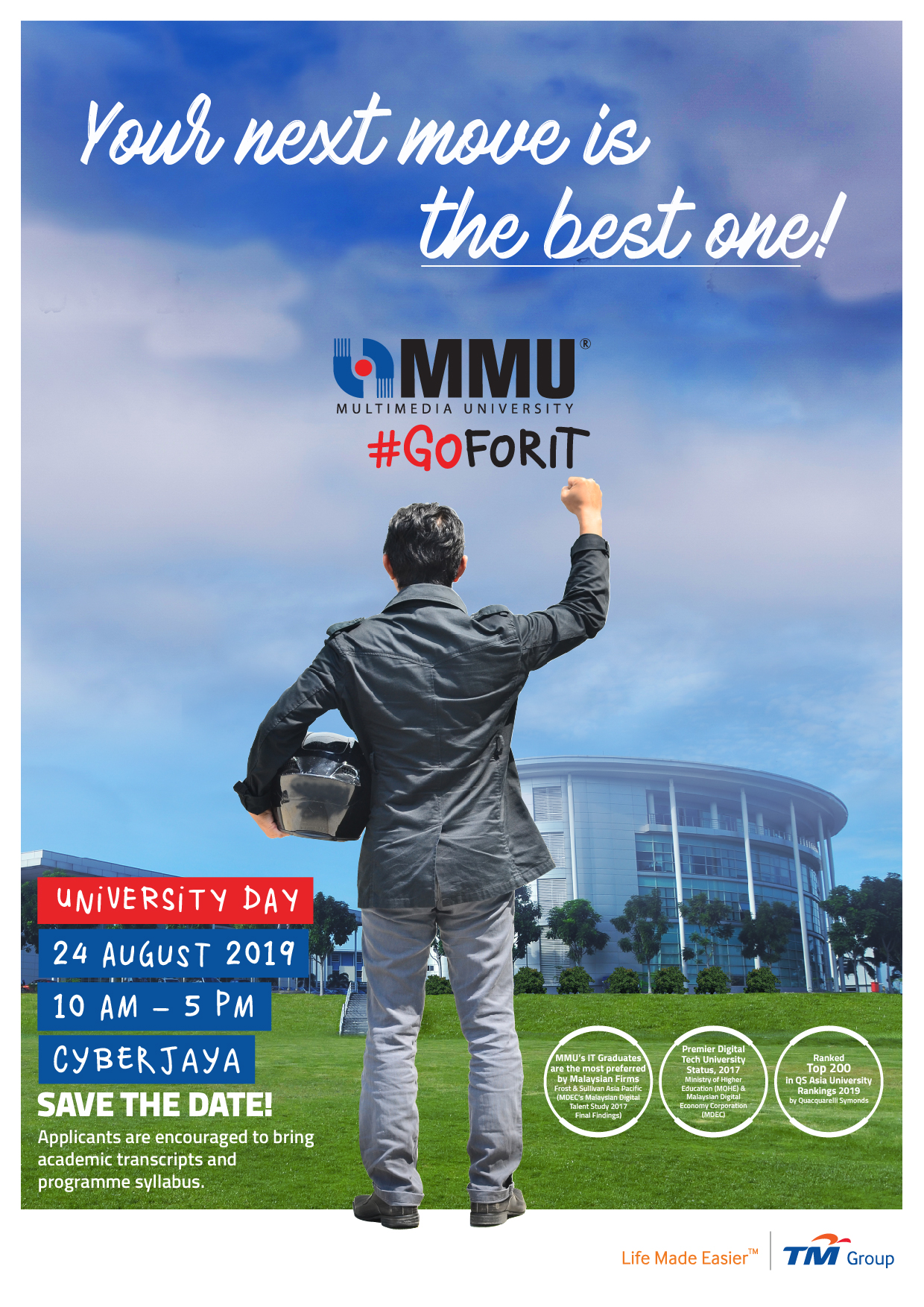 Come and join us at our University Day this 24 August 2019. Visit us at our Cyberjaya campus to get more insights on our programmes offered that caters to your interest. Do bring your academic transcript and programme syllabus if you are applying for our Bachelor’s degree programmes at MMU. See you there!