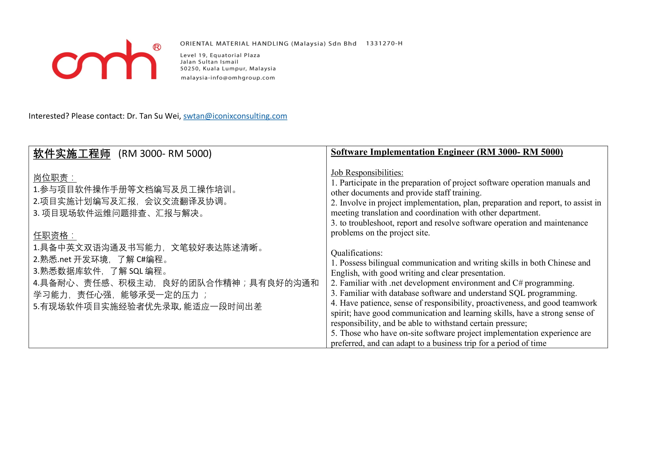 Recruiting fresh graduate for the position of software engineers at Oriental Material Handling (OMH)