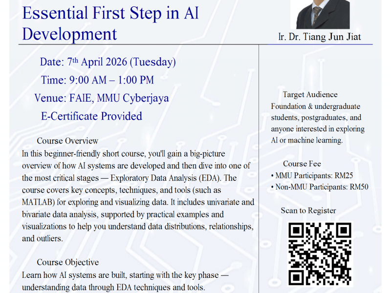 FAIE Short Courses: Exploratory Data Analysis (EDA) for AI Enthusiasts 17 March 2026 Announcement, News Our short courses are customized for students, with the following objectives: 1. To help students enhance their understanding and knowledge of ...