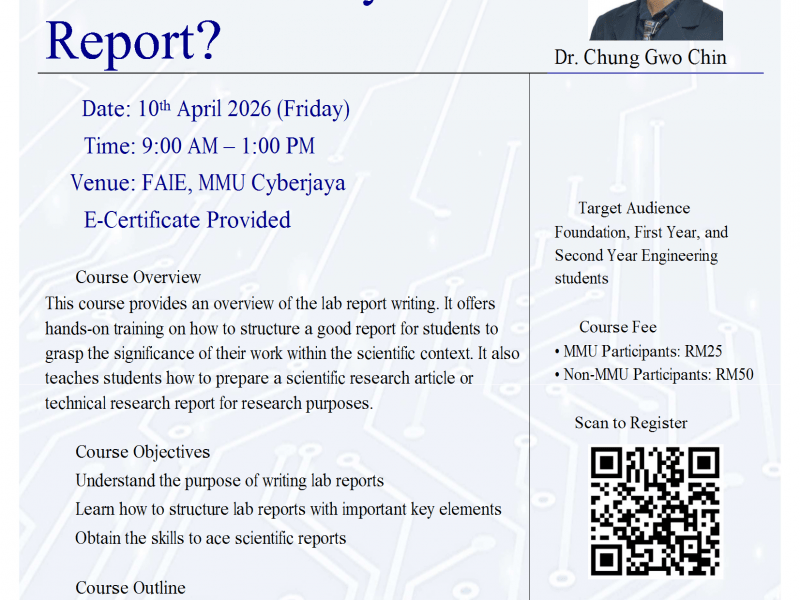 FAIE Short Courses: How To Ace My Lab Report? 17 March 2026 Announcement, News Our short courses are customized for students, with the following objectives: 1. To help students enhance their understanding and knowledge of ...