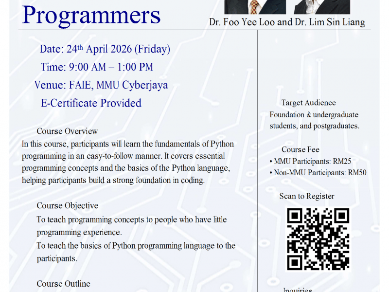 FAIE Short Courses: Python for Non-Programmers 17 March 2026 Announcement, News Our short courses are customized for students, with the following objectives: 1. To help students enhance their understanding and knowledge of ...