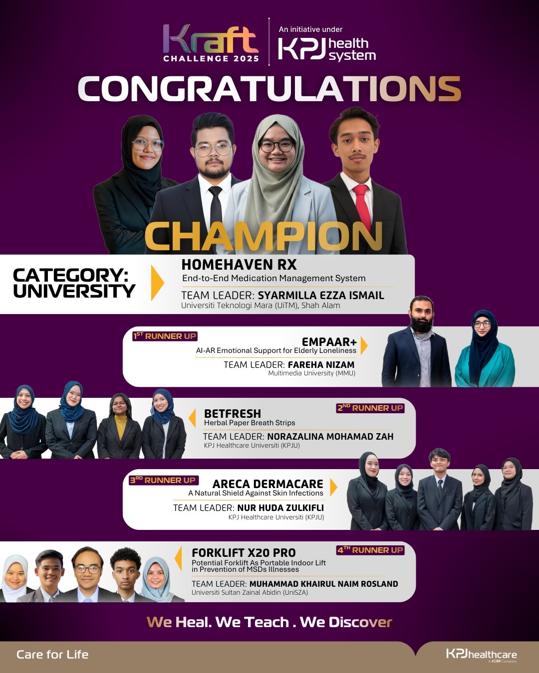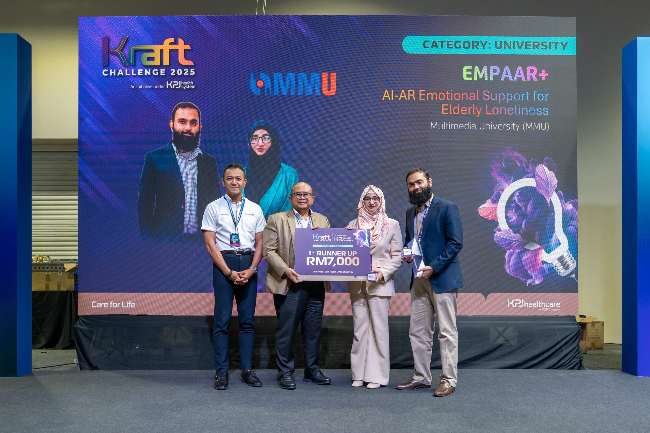 Our team from Multimedia University recently secured the First Runner-Up (Second position) at the KRAFT 2025 Challenge, organized by KPJ Healthcare in collaboration with the Ministry of Health Malaysia held in conjunction with MIH Megatrends 2025 at Kuala Lumpur Conventional Center on 25-27 November 2025. The team was awarded RM 7,000 in prize money for their achievement. The competition focused on innovative digital-health solutions for national healthcare needs.