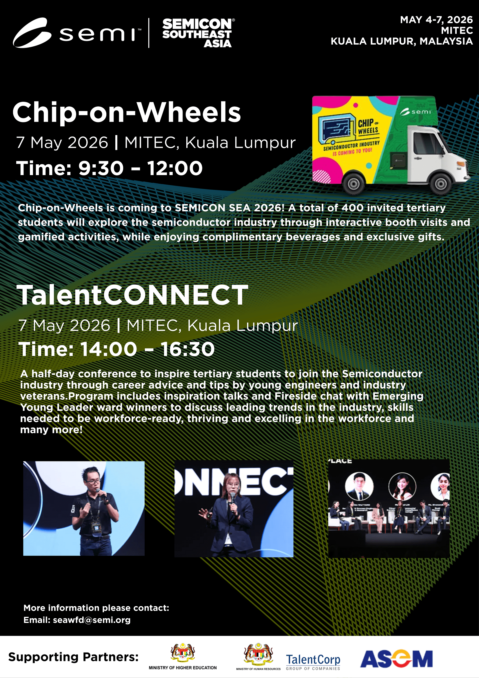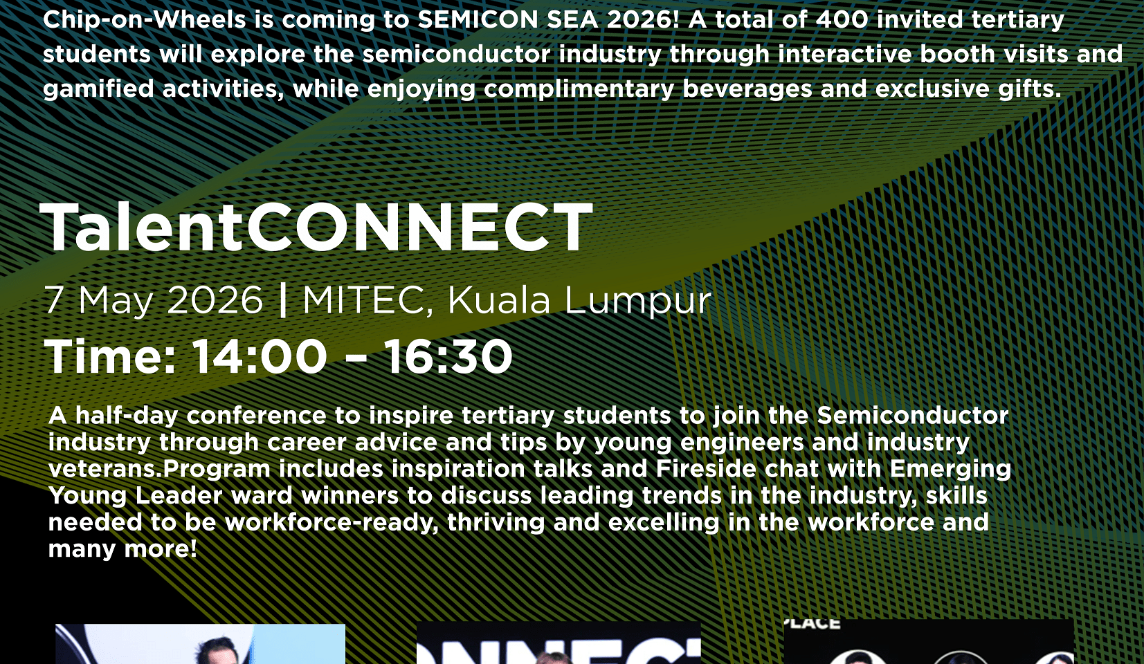 On behalf of SEMI, we are pleased to invite E&E students from Multimedia University to participate in TalentConnect on 7 May 2026, a sub-event of SEMICON Southeast Asia 2026.