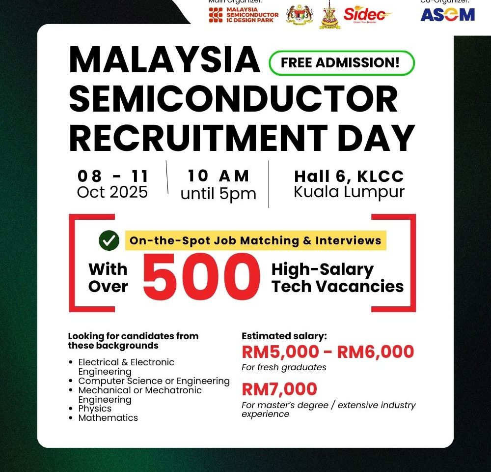 Over 𝟯𝟬 𝗧𝗒𝗣 π—²π—Ίπ—½π—Ήπ—Όπ˜†π—²π—Ώπ˜€ are hiring at the Malaysia Semiconductor Recruitment Day (MSRD) 2025 with more than 500 high-value tech vacancies on offer.