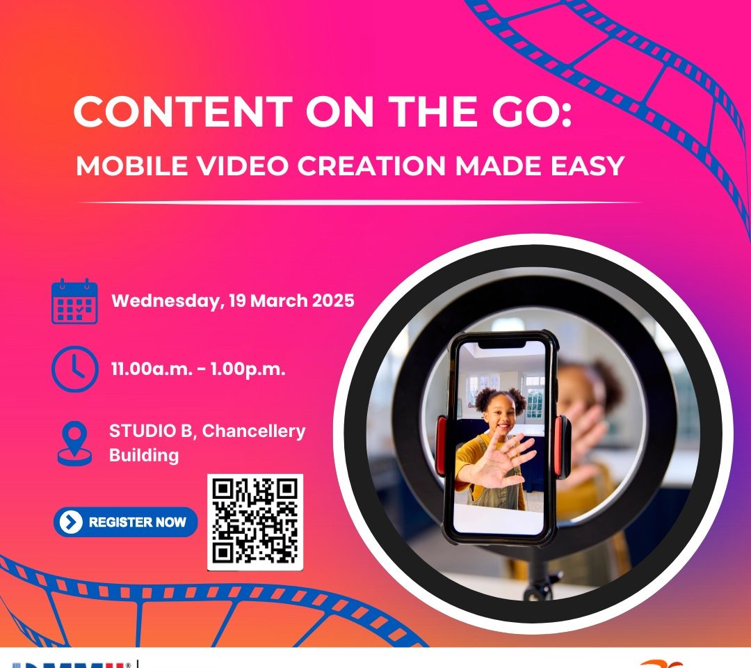 Bring your FULLY CHARGED phone to Studio B at the Chancellery Building on Wednesday, 19 March 2025 from 11.00a.m. to 1.00p.m. Let’s get creative and learn from the PROS!